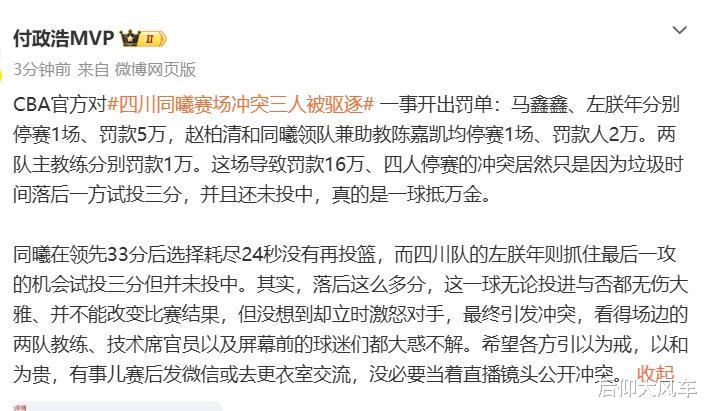 四川队吃到了禁赛1场+6万元的罚款,同曦2名主力被禁赛+罚款6万,双方教练组成员也分别吃到罚单,两队球员、教练合计一共被吹罚禁赛4场+16万元的处罚(王世龙和杨城无疑是最冤的),禁赛场次之多,罚款数额之大,是本赛季至今为止,CBA开出的最重磅罚单!