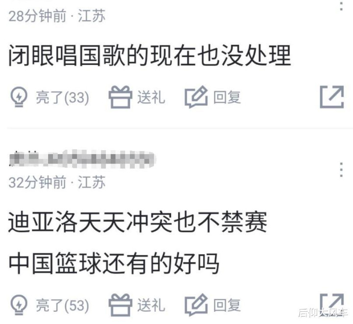 另一部分球迷则对CBA表达了不满,分别拿了迪亚洛和前段时间在奏唱国歌仪式中没有行注目礼的徐远征来说事:迪亚洛天天冲突也不禁赛,中国篮球还有的好吗?闭眼唱国歌的现在也没有处理!